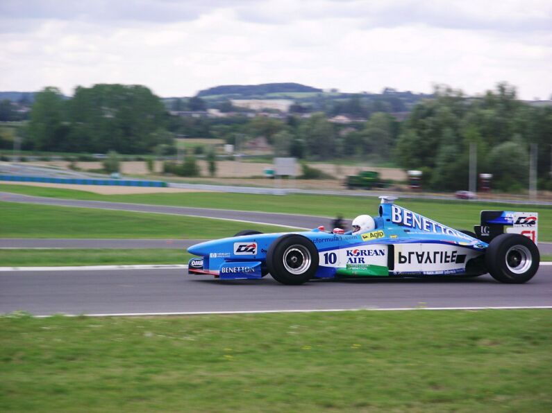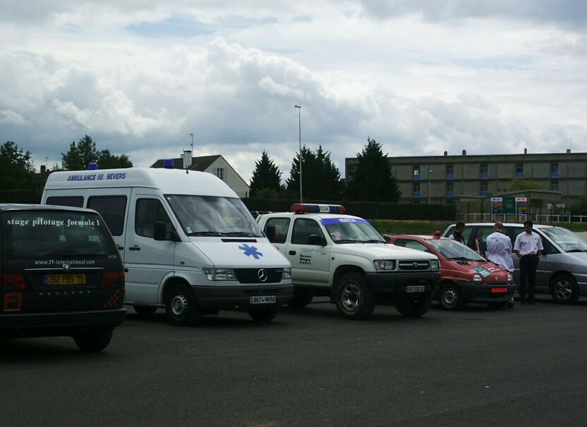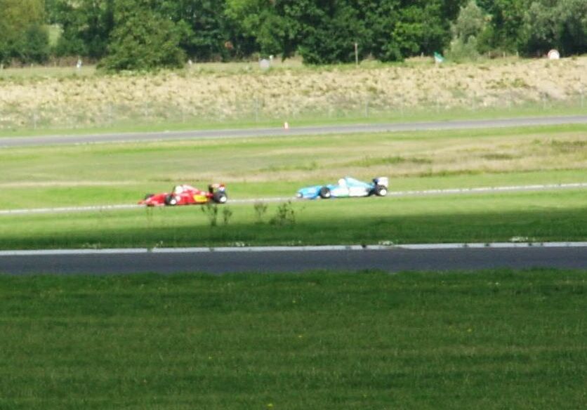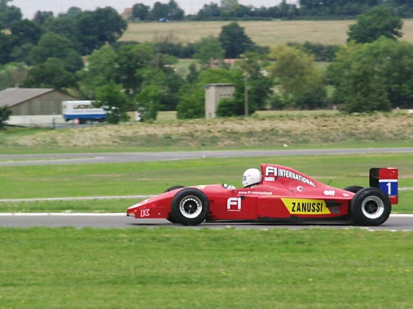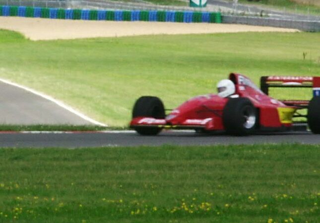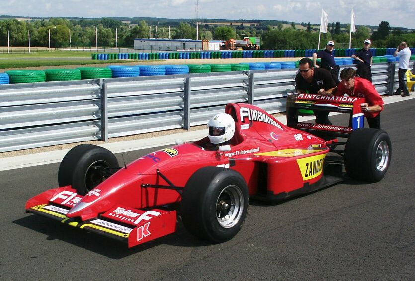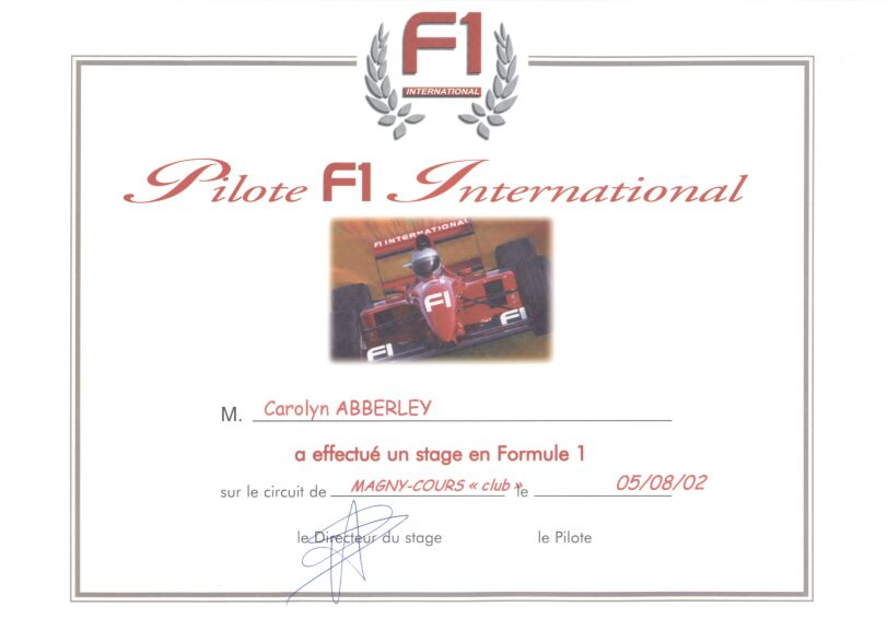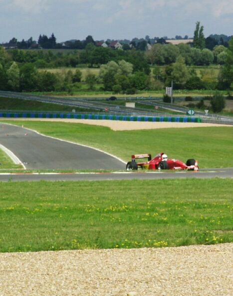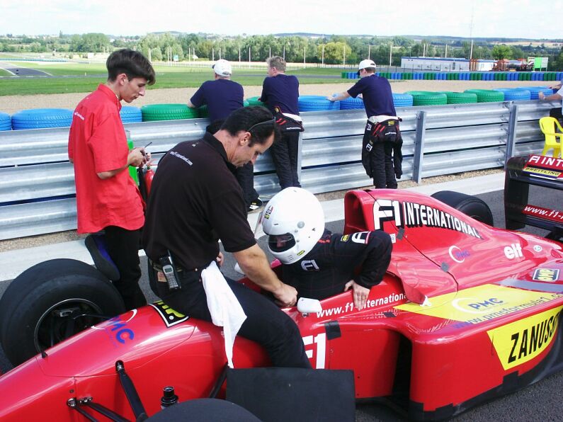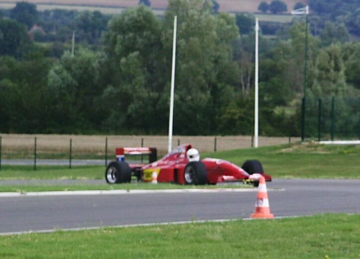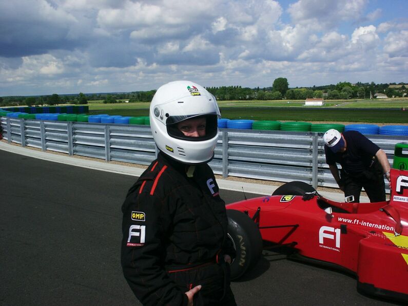 On Monday morning we headed to Magny-Cours, where our "team" awaited us at the Club Circuit (above right), a 2.5km track designed as a training circuit with a good mix of different corners spread over undulating terrain - a hairpin, chicanes, long, fast curves and the all important long straight. There were four cars at the track - two 1994 Larrousse, a 1996 Arrows (apparently driven by Damon Hill, although it must have been only in testing given that he didn't join the team until 1997) and a 1998 ex-Fisichella Benetton. All however are powered by the same 3.5 litre Ford Cosworth V8 engines, with six-speed semi-automatic gearboxes, so apart from aero differences (pretty much irrelevant at the speeds we reached!), performance is the same in all the cars which are allocated according to driver size! We were kitted out with boots, race suit and balaclava into which we changed before a one hour briefing on how to drive these beasts, covering the effects of weight transfer under braking and acceleration, the lines we would need to take through the corners, rules of the track and above all the importance of driving within your limits - no new world champions would be created today, but we were promised an experience we wouldn't forget in a hurry! Our instructor, Stefan, then took us round the circuit in a road car, talking us through the lap ... just three laps and the next time we'd be on our own in an F1 car - nerves were definitely beginning to show now! The track was helpfully marked out with cones to show the braking points, turn-in points and apexes, without which I doubt any of us would successfully have navigated the circuit! Hugely relieved not to be the first out, I watched as the first two safely negotiated their 10 lap allocation ... the grins on their faces when they returned almost sufficient to ease the ever-rising terror! But as the next two went out, my name was called and the butterflies returned full-force. I went off to collect my helmet and handed my camera to Philip to get as many pics of me as he could, with a quiet aside that he could stop shooting if I went off! I was allocated the red Larrousse, and having squeezed in was pleasantly surprised at how comfortable it was considering there was no proper seat ... judicious use of padding made for a one size fits all solution! One of my biggest fears when I was anticipating this day was not being able to pull away ... I was relieved therefore that a problem with the gearbox for which a part was awaited, meant that a bump start was called for. Clutch in, two guys pushing, then "GO", snatch your foot off the clutch, the engine roars into life behind you and you're away. I will never forget the exhilaration of feeling that power for the first time and although I'm pretty sure the grin stayed on my face throughout, I was very quickly at the first corner and trying to remember what all the cones meant! I crawled round the first few laps, not that it felt like crawling at the time, but I was worried if I went too fast, I wouldn't be able to brake hard enough to stop. Around my 4th lap, I came up behind the other driver on the straight and, slightly unsighted, missed my braking point ... braking late and hard, I was delighted to find I could indeed stop and from that point, built up speed lap on lap. The first time I really let it go down the straight, hard on the throttle, up through the gears to 6th, was an absolute blast ... even thinking about it now, I can feel the incredible acceleration ... but just as you're thinking, "wow, I could get to enjoy this", it's hard on the brakes again for the chicane and another huge buzz from controlling that sort of power! My favourite bit of the circuit however was the sweeping right hander, followed by a tighter left hander that came next ... if you get the line right going in, you just hold the steering wheel still and accelerate right the way through the first part, then a slight lift, switch direction and power on again for the second part ... I LOVED IT!!!! At the end of that section stood Stefan, counting laps and giving the signal to come in ... for the last few laps I was expecting the signal each time I came around and even got to the point of thinking "oh, not another lap!" ... it was only when I came back in that I found he'd had to return to the pits part way through my stint and I actually got 13 laps :-) These words and pictures give you some idea of what the day was like, but I'm a poor wordsmith and cannot do justice to the mind-blowing nature of this experience ... if you EVER get the chance to do it, don't hesitate, it really is the "drive of a lifetime". |